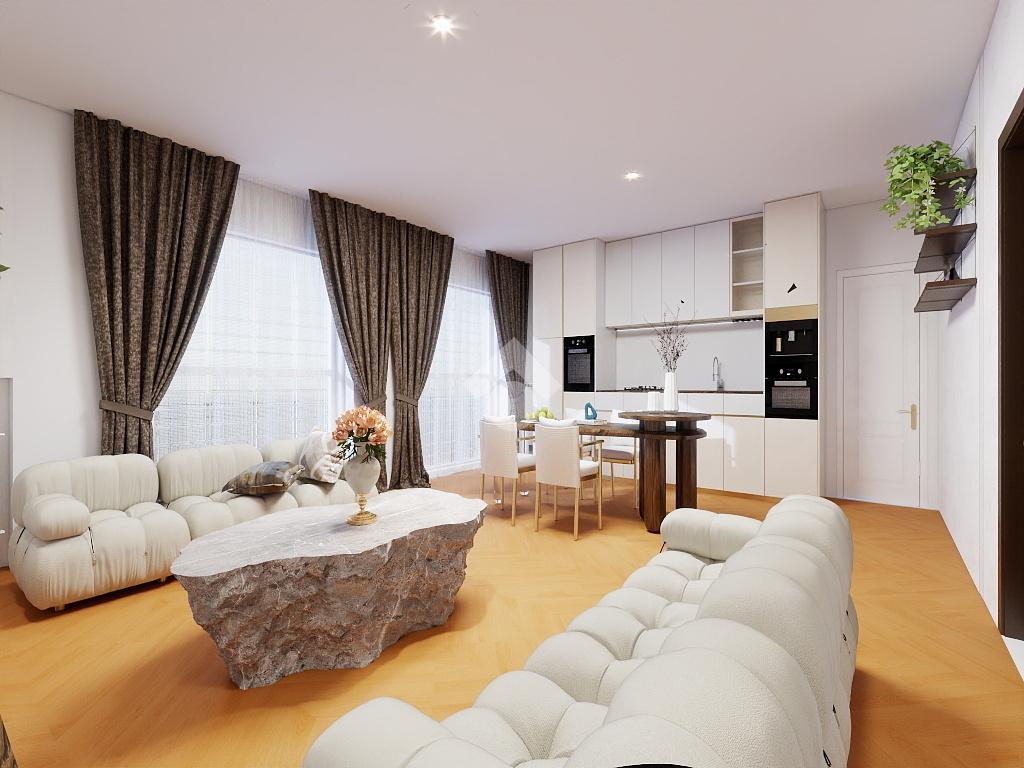L'immobile si apre su un'ampia e luminosa zona giorno con salone e cucina a vista, ideata per favorire convivialità e comfort, con accesso diretto al balcone che rappresenta una vera e propria chicca, perfetta per momenti di relax all'aperto.